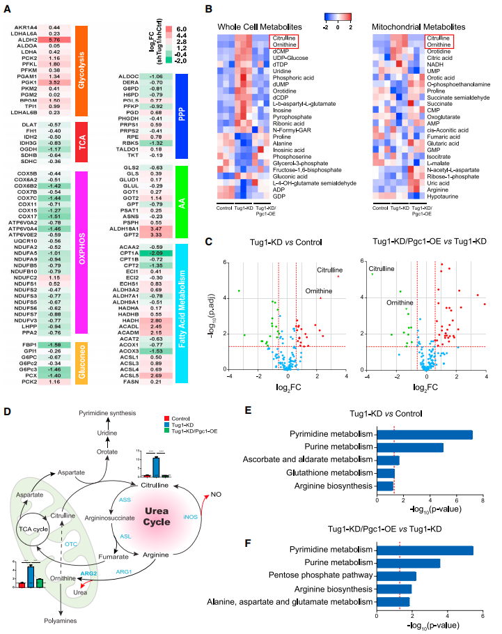 已知细胞在响应外部代谢信号时表现出代谢重塑,其特征是通过在底物和/或代谢途径之间的转换来适应代谢需求的变化。为了进一步了解Tug1在关键代谢途径中的作用,作者重新分析了他们之前释放的足细胞无偏性比较转录组数据,该数据分为Tug1-knockdown (shTug1)和scramble short hairpin RNA (shRNA) control (shCtrl) 两组,该结果为糖酵解、三羧酸循环和氧化磷酸化(OXPHOS)中酶催化反应的一系列mRNA变化提供了一些早期线索(图4A)。接下来,对全细胞和线粒体代谢物进行代谢组分析。在测定的糖酵解、TCA循环、氨基酸的中间体中,作者发现尿素循环(也被称为精氨酸-瓜氨酸循环)的中间体在最显著被改变的,在Tug1-KD和Tug1-KD/Pgc1-OE细胞中(图4B)。Tug1-KD细胞中,与对照组比,尿素循环的两种中间产物鸟氨酸和瓜氨酸是上调最显著的代谢物,与Tug1-KD细胞比较,它们是Tug1-KD/Pgc1-OE足细胞中下调最显著的代谢物,提示Tug1/PGC1α轴对这两种关键代谢物具有调节作用(图4C-4D)。代谢产物富集分析也表明嘧啶代谢,尿素循环的下游副产物和精氨酸的生物合成是富集最多的途径(图4E和4F)。