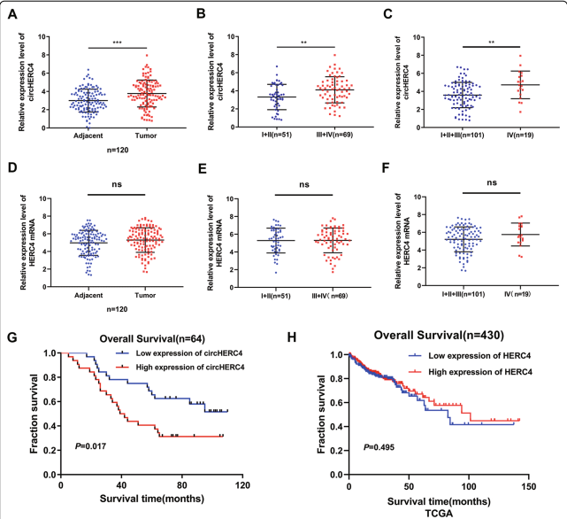 2. circHERC4而非HERC4 mRNA的过度表达与结肠癌患者预后不良相关