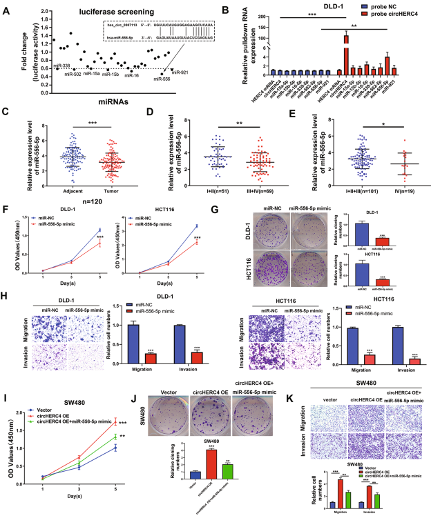 qPCR检测证实了miR-556-5p在CRC组织中下调(图4c),miR-556-5p在有淋巴转移(图4d)或远处转移(图4e)患者中的表达水平要低得多。淋巴结转移阳性的患者miR-556-5p水平较低,而其他特征与miR-556-5p的表达无显著相关性(表2)。miR-556-5p能显著抑制CRC细胞的增殖、迁移和侵袭能力(图4f-h)。拯救实验中miR-556-5p模拟物可以部分恢复过表达circHERC4增强的SW480细胞的增殖、迁移和侵袭能力(图4i-k)。综上所示,这些结果提供了证据,表明miR-556-5p具有抗癌作用,并通过直接结合CRC部分介导circHERC4的致癌功能。