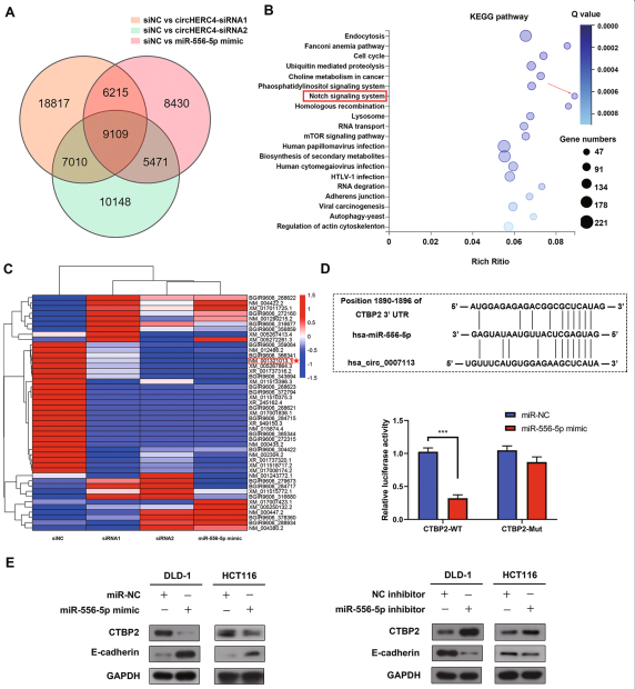 根据维恩图(图5a),筛选出了9109个在circHERC4沉默和miR-556-5p过表达的DLD-1细胞中显著改变的转录本。KEGG通路富集分析显示,这9109个转录本富集在许多肿瘤相关信号通路中,尤其是与结肠癌发生相关的Notch信号通路(图5b)。因此, circHERC4可能通过激活Notch信号通路促进细胞转移,而Notch信号通路可能被miR-556-5p阻断。