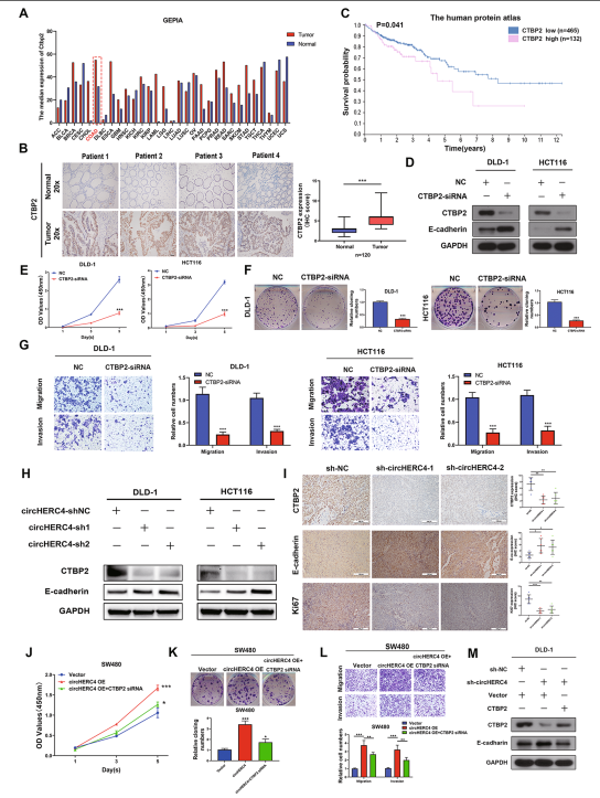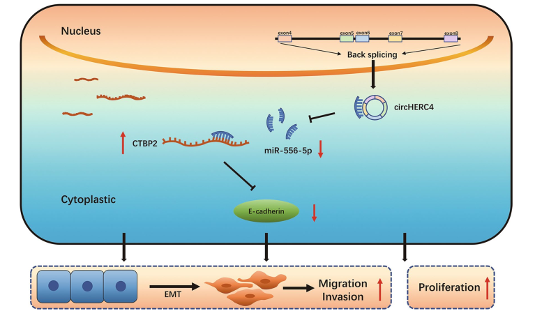 He J, Chu Z, Lai W, et al. Circular RNA circHERC4 as a novel oncogenic driver to promote tumor metastasis via the miR-556-5p/CTBP2/E-cadherin axis in colorectal cancer. J Hematol Oncol. 2021; 14(1):194.