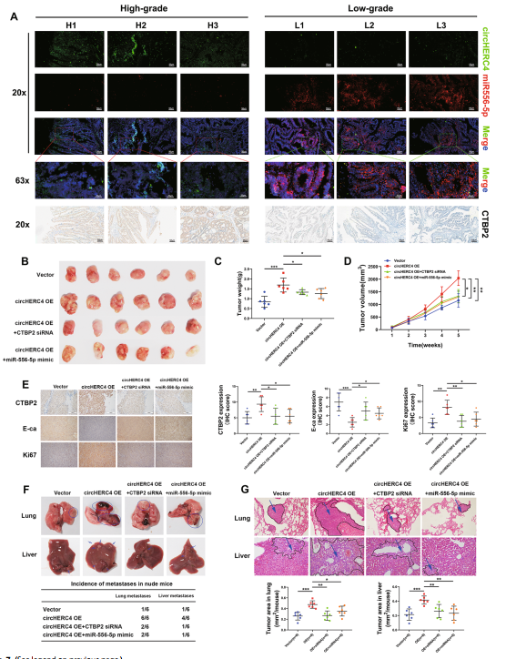 当circHERC4被敲低时,CTBP2蛋白水平显著下降。相反,CTBP2的下游靶蛋白E-cadherin在这些条件下显著增加(图6h),Ki-67在circHERC4沉默后急剧下调(图6i)。挽救实验来研究circHERC4和CTBP2之间的功能相互作用。与转染空载体或siNC模拟物的SW480细胞相比,转染CTBP2 siRNA模拟物的过表达circHERC4细胞的增殖、迁移和侵袭能力明显下降(图6j-l),circHERC4的致癌功能可以通过消除CTBP2的表达而部分逆转。Western blotting结果显示,CTBP2可以部分恢复circHERC4对E-cadherin表达的影响(图6m)。circHERC4和CTBP2在高级别CRC组织中过表达,而miR-556-5p在低级别CRC组织中更丰富(图7a)。异种皮下移植的结果表明,circHERC4过表达可加速肿瘤生长,注射CTBP2 siRNA或miR-556-5p mimic后,这种作用可被抑制(图7b-d)。免疫组化实验表明,沉默CTBP2或过表达miR-556-5p来部分挽救circHERC4对CTBP2 和Ki67促进、E-cadherin抑制的作用。在尾静脉注射小鼠模型中,上调circHERC4可促进肺和肝脏转移性结节的形成,当CTBP2下调或miR-556-5p上调时,circHERC4诱导的致癌作用被阻断(图7f-g)。总的来说,这些结果证明CTBP2可以促进CRC的进展,并且在体内和体外都受到circHERC4/miR-556-5p轴的调控。