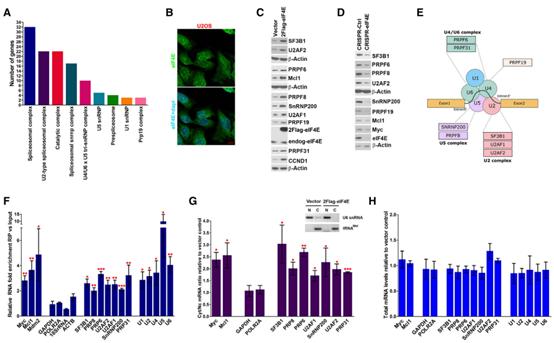 为探究潜在的eIF4E剪接轴,作者基于以下几个原因优先使用U2OS细胞进行研究。首先,与上述淋巴瘤细胞不同,U2OS细胞具有内源性eIF4E水平,这与健康的志愿者细胞相似,使作者能够测量eIF4E过表达的影响。其次,在细胞核中观察到内源性和过表达的eIF4E,这与剪接和细胞质中的潜在作用一致(图1B-H)。第三,eIF4E在这些细胞的capping、CPA、核RNA输出和翻译中发挥着公认的cap - dependent作用。最后,淋巴瘤和U2OS细胞之间这些相互作用的保守性表明这是eIF4E的一般功能,而不是淋巴瘤特有的现象。考虑到这些,作者生成了3个稳定的2FLAG-eIF4E过表达或vector对照细胞株。首先确定eIF4E是否调节SFs的水平。WB显示,在2FLAG-eIF4E细胞中,SF3B1、U2AF1、U2AF2、PRPF6、PRPF8、PRPF19、PRPF31、SNRNP200蛋白水平较Vector对照组升高约2 ~ 3倍(图1C)。CyclinD1和Mcl1作为阳性对照,而b-actin作为阴性对照,因为它们不是eIF4E的靶标(图1C)。与过表达相反,使用CRISPR-eIF4E或CRISPR-Ctrl U2OS细胞系检测结果显示内源性eIF4E敲低会降低这些SFs的水平(图1D)。这些发现表明内源性eIF4E影响剪接机制的产生,因此,eIF4E对SFs的影响并不局限于以eIF4E升高为特征的环境。总之,eIF4E依赖的方式可以驱动SFs的产生。eIF4E靶向的SFs存在于每个主要的剪接体复合体中(图1A和1E)。