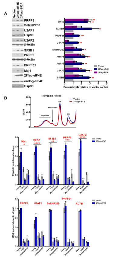 为更深入地研究一些SFs在RNA输出和翻译水平上共同调控的可能性,作者使用多聚体装载来直接测量翻译效率,即每个转录本装载的核糖体数量(图2B)。如预期的,2FLAG-eIF4E和Vector细胞的整体多核糖体特征是不可区分的(图2B)。在较重的馏分中发现的转录本,每个转录本有更多的核糖体,因此比在较轻的馏分中发现的转录本翻译效率更高。用RT-qPCR比较了2FLAG-eIF4E和Vector U2OS细胞系中单体、轻质和重质多核糖体部分的SF编码RNA含量(图2B)。预计在翻译水平上受到影响的RNA在重核糖体部分会增加,同时在轻核糖体和单体部分会减少。发现ACTB mRNAs没有因为eIF4E的表达而发生改变,而阳性对照MYC和VEGF则如预期的那样转移到较重的核糖体中。PRP31、U2AF1、SNRNP200或PRPF6转录物的核糖体负荷没有变化。然而,PRPF8、SF3B1和U2AF2 mRNAs的特点是eIF4E依赖性地转移到重多核糖体,并在轻核糖体和单体部分减少(图2B,中间部分)。与S53A突变体观察到的蛋白水平一致,观察到这里的大多数eIF4E目标是核输出目标;然而,少数目标在输出和翻译水平上都对eIF4E敏感,使得它们对eIF4E水平更加敏感。