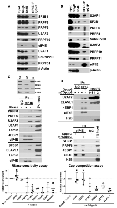 图4eIF4E以RNA和帽依赖的方式与剪接机制发生物理相互作用