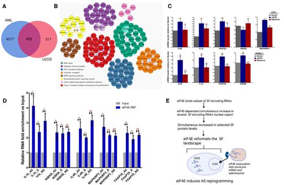 接下来研究了eIF4E依赖性剪接在AML中的相关性,因为在AML中用利ribavirin靶向eIF4E提供了临床益处,包括在早期临床试验中AML患者中的一部分得到缓解。第一步,作者分析了来自437份AML患者样本和17份来源于人脐带血的正常CD34+细胞样本的RNA-Seq数据(图6A-C)。通过RNA-Seq数据对样本进行了预筛选,以确保样本不携带AML中报告的主要突变,即U2AF1、SRSF2或SF3B1的突变,使用正常CD34+细胞作为eIF4E水平基准,将AML标本分为高eIF4E组和正常eIF4E组(图6A-B)。在rMATS分析中,选择10个eIF4E水平最高的AML标本和11个eIF4E水平正常的标本,即与正常CD34+细胞中的水平重叠或低于其水平(图6A-C)。相应的临床数据显示,与11名eIF4E水平最低的AML患者(1396天,图6C)相比,10名高eIF4E的AML患者的总生存期急剧下降(中位生存期136天,图6C)。用rMATS比较这些高eIF4E和正常eIF4E标本的剪接谱,观察到~1,600个差异剪接事件,影响到~1,500个RNA(FDR-adjusted Pvalue< 0.1, absolute value of inclusion level differences of > 0.1),如果降低阈值((absolute inclusion value difference of > 0.05 and FDR-adjusted Pvalue< 0.15),则有~12,000个差异剪接事件影响~4,600个转录物(图6D)。对这些AS事件进行无监督聚类分析,发现AML患者eIF4E表达状态与MXE事件密切相关,在监测MXE事件时,20/21例AML标本的eIF4E水平是聚集的基础(图6E)。与U2OS细胞相似,观察到eIF4E依赖的MXE靶点的前GO富集项与U2OS数据集中的高度相似:细胞周期,DNA修复,膜运输和RNA代谢,PPI富集于有丝分裂中心体、膜运输和notch信号通路(图6F)。U2OS和AML数据集中所有eIF4E依赖的剪接靶点的交集获得了一组核心的约450个常见RNA靶点(图7A)。类似的,GO和PPI分析显示它们也富集到细胞周期,DNA修复,膜运输,染色质修饰,适应性免疫系统,MYC激活等(图7B)。