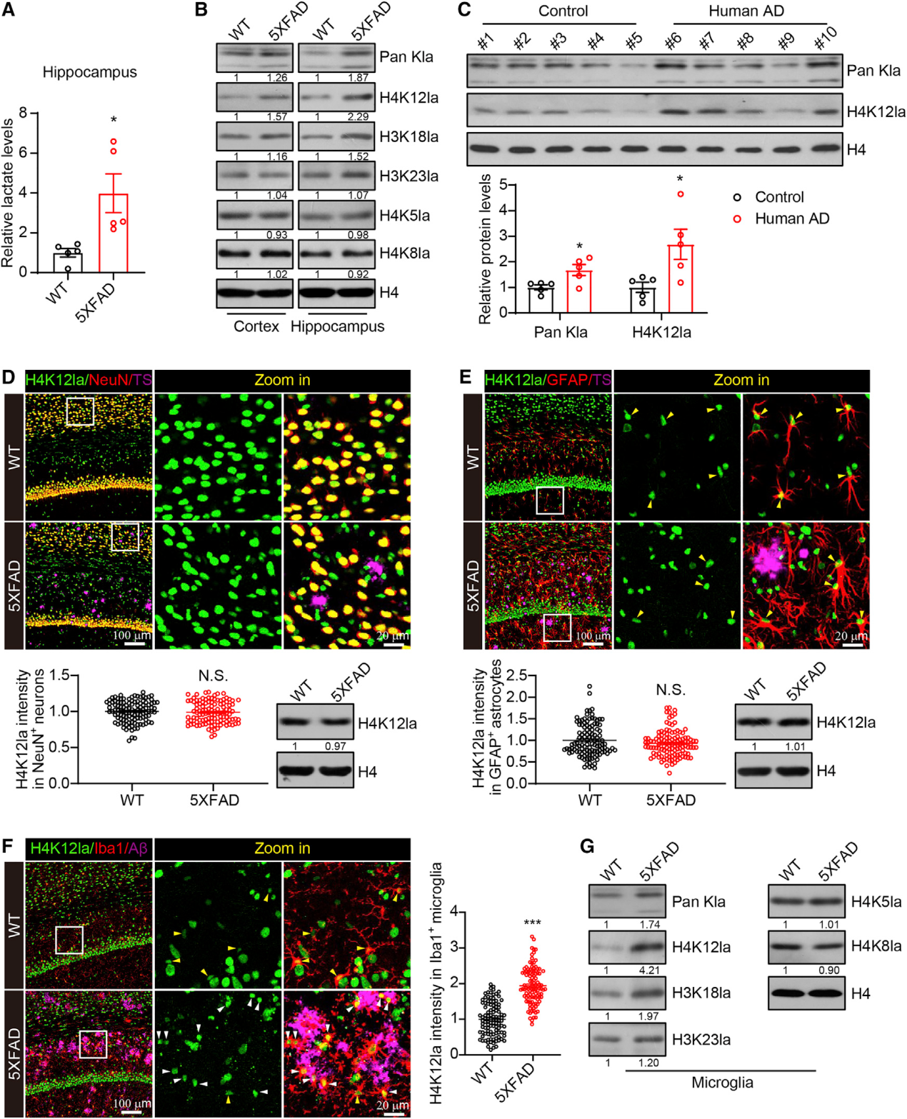 由于乳酸作为一种前体可以刺激组蛋白乳酸化,因此很容易假设组蛋白乳酸化可能在AD的背景下发生改变。酸提取组蛋白的WB分析显示,与年龄匹配的WT小鼠相比,12月龄5XFAD小鼠的额叶皮层和海马中的泛赖氨酸乳酸化(Pan Kla)和H4K12la水平均有所增加(图1B)。通过对小鼠的观察,AD患者死后脑组织中Pan Kla和H4K12la的水平较健康人明显升高(图1C)。这些结果支持在AD的情况下乳酸和组蛋白乳酸化都增加。