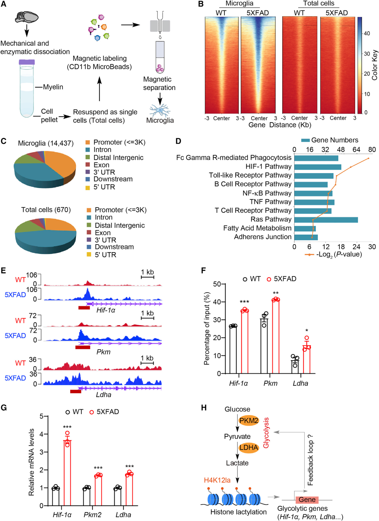 为了研究H4K12la对5XFAD小鼠小胶质细胞的表观遗传调控作用,我们将5XFAD小鼠小胶质细胞启动子处不同H4K12la结合峰的4410个靶基因按基因本体划分为不同的KEGG通路(图2D)。这些KEGG通路包括参与糖酵解和炎症的HIF-1、toll样受体、NF-kB和tnf信号通路(图2D)。这些峰在糖酵解基因(包括Hif-1a、Pkm和Ldha)上鉴定出候选基因组位点,表明这些基因启动子处的H4K12la水平升高(图2E)。