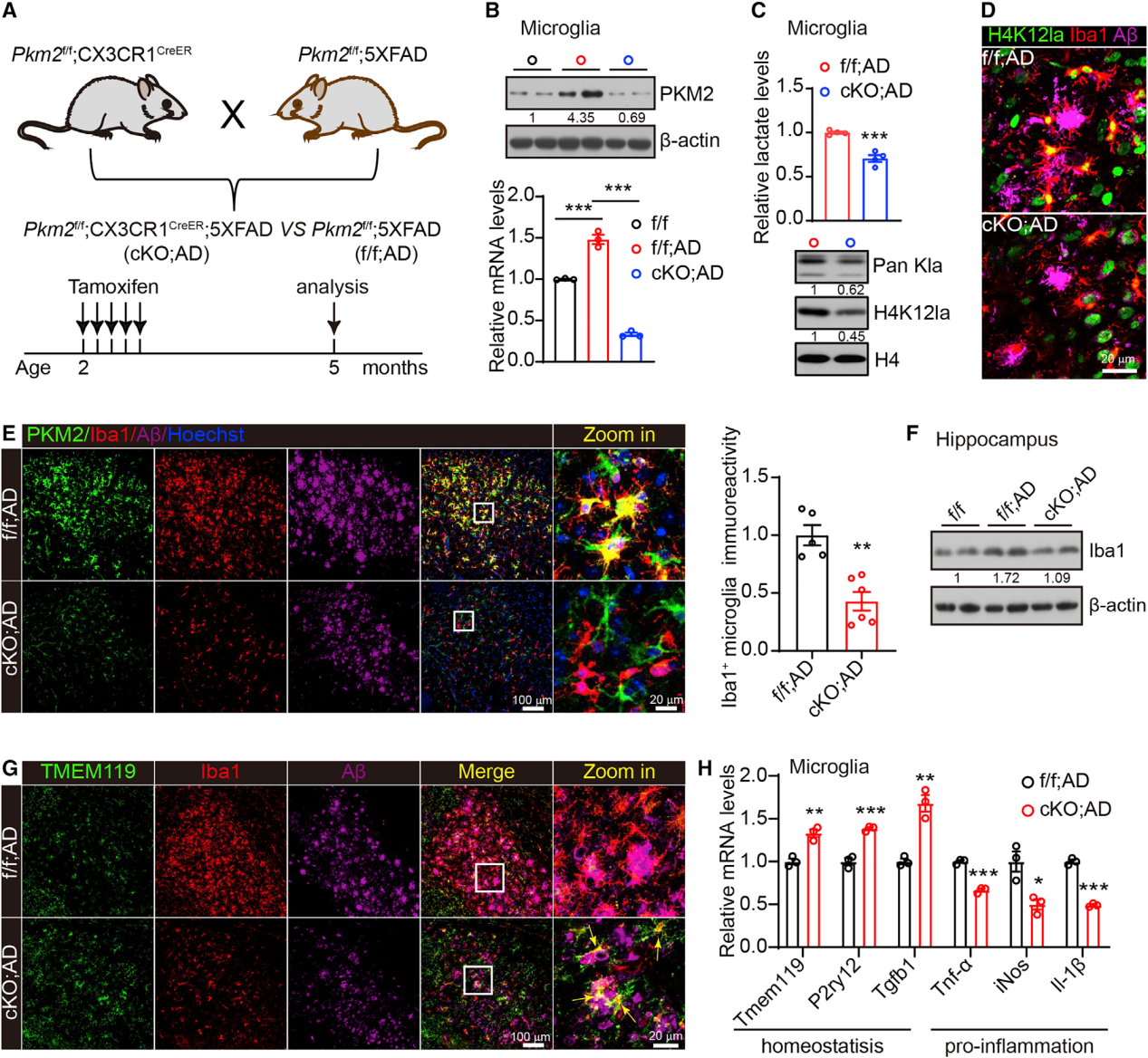 对小鼠脑切片进行Iba1、Aβ(抗6E10)和TMEM119(一种小胶质细胞特异性稳态蛋白)的联合染色。正如预期的那样,Iba1+TMEM119−表明,f/f;AD小鼠的Aβ斑块邻近小胶质细胞偏离了稳态阶段小胶质细胞(图S5)。然而,Aβ斑块周围的小胶质细胞在cKO;AD小鼠中部分重新表达了TMEM119(图4G)。qPCR表明,与f/f;AD小胶质细胞相比,从cKO;AD小鼠中分离出的小胶质细胞显著增加了小胶质细胞稳态基因如Tmem119, P2ry12和Tgfb1的表达,而促炎基因包括Tnf-a, iNos和Il-1b的表达显著降低(图4H)。这些发现表明,通过基因删除PKM2来中断糖酵解/H4K12la/PKM2环可抑制5XFAD小鼠的小胶质细胞促炎激活。