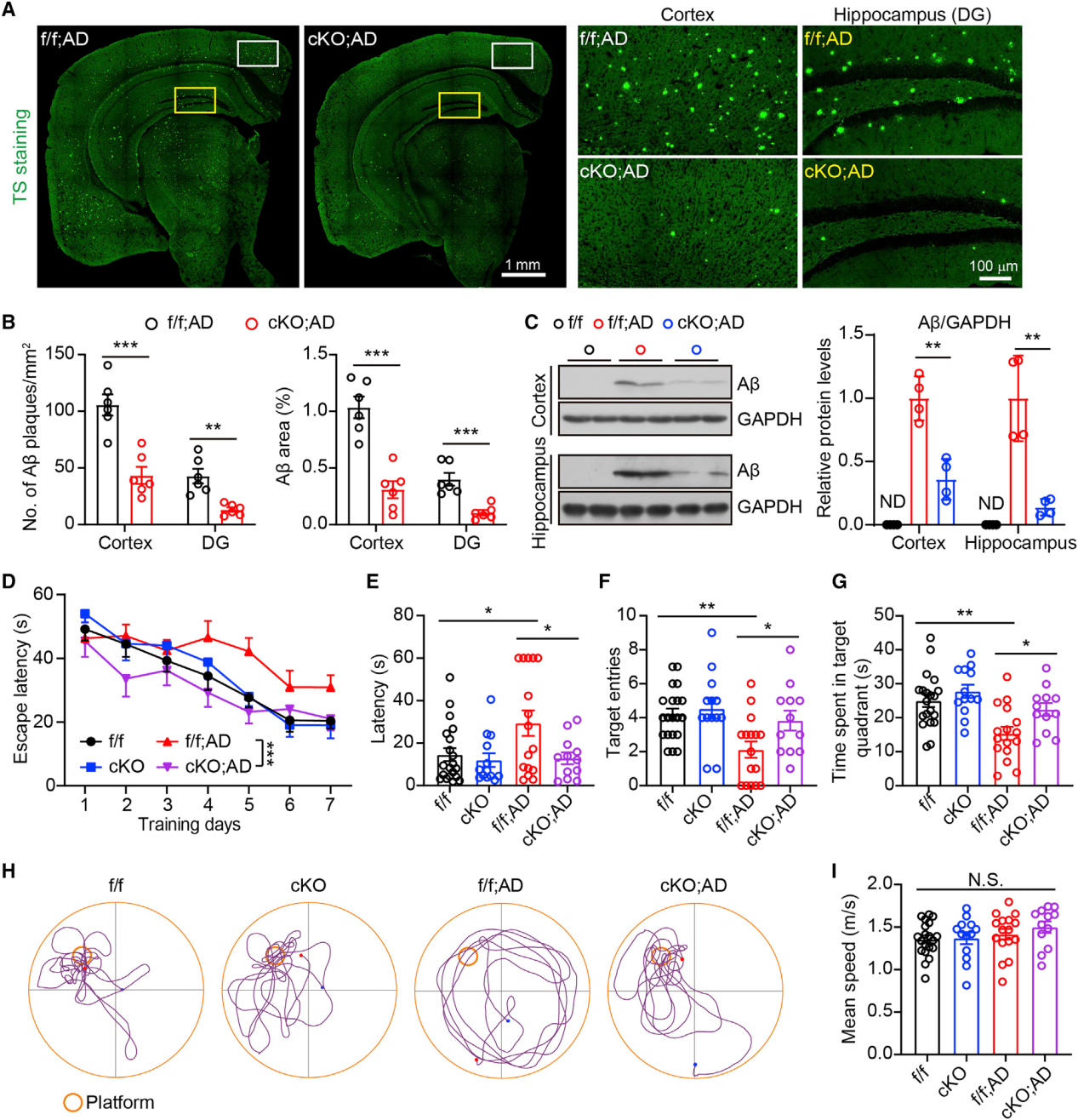 小胶质细胞介导的神经炎症促进了Aβ的产生并促进了Aβ斑块的形成。我们采用TS染色法检测f/f;AD和cKO;AD小鼠脑切片中的Aβ斑块,探讨糖酵解/H4K12la/PKM2环的中断是否会影响AD小鼠的Aβ病理。小胶质细胞特异性消融Pkm2导致包括皮质和海马在内的大脑区域Aβ斑块含量显著降低(图5A和5B)。与我们的TS染色结果一致,WB显示cKO;AD小鼠的皮质和海马中Aβ水平与f/f;AD小鼠相比显著降低(图5C)。此外,与f/f;AD小鼠相比,cKO;AD小鼠营养不良神经突的总面积(lamp1阳性免疫染色信号)显著减少(图S6),表明AD小鼠小胶质细胞Pkm2缺失具有神经保护作用。这些结果表明,通过破坏PKM2功能来中断糖酵解/H4K12la/PKM2环可以改善5XFAD小鼠的Aβ病理。
